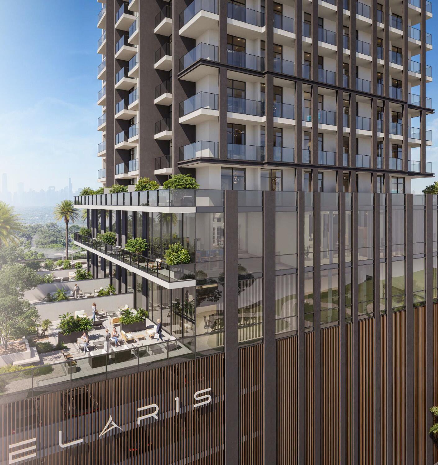 ELAR1S Rise is a new residential development by ELAR1S located in Jumeirah Village Triangle (JVT). Its architecture blends modern design with organic shapes, offering a sense of balance and comfort. The building features retail units on the ground floor, office spaces, and residential levels arranged for optimal functionality. The 12th floor houses a clubhouse, while the rooftop includes a sky infinity pool with panoramic views.